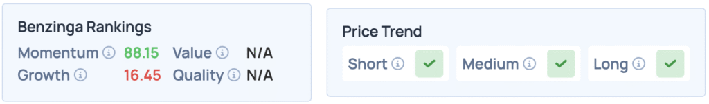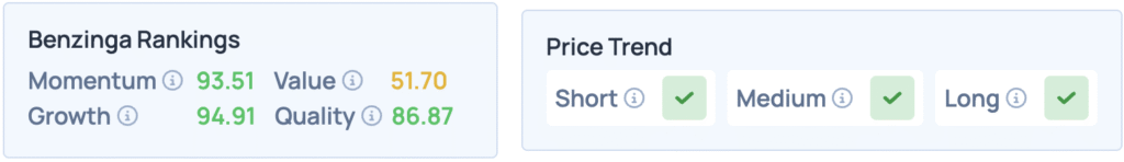 Il titolo ottiene un punteggio elevato in tutte le classifiche di Benzinga, con un andamento favorevole dei prezzi a breve, medio e lungo termine. Clicca qui per approfondimenti sulla società, i suoi pari e i suoi concorrenti.