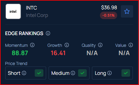 L’Edge Ranking di Benzinga colloca Intel all’89° percentile per slancio e al 16° percentile per crescita, riflettendo una performance mista. I dettagli delle altre metriche sono disponibili qui.