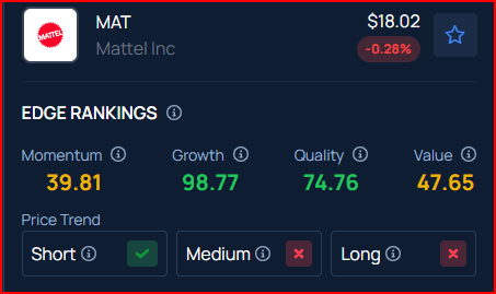 L’Edge Stock Ranking di Benzinga colloca Mattel al 74° percentile per qualità e al 99° percentile per crescita, riflettendo le solide prestazioni dell’azienda in entrambi i settori. Dai un’occhiata al report qui.
