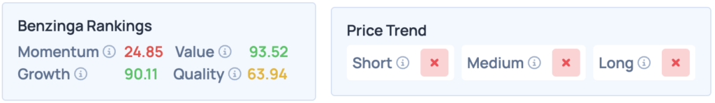 Secondo l’Edge Stock Rankings di Benzinga, il titolo ottiene un punteggio elevato per Crescita e Valore, ma va male per Momentum e Qualità. Ha anche una tendenza dei prezzi sfavorevole nel breve, medio e lungo termine. Clicca qui per approfondimenti sul titolo, sui suoi pari e sui suoi concorrenti.